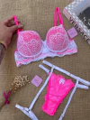 O Conjunto NICOLE COM CINTA LIGA é confeccionado em renda e tule de poliamida com elastano. O sutiã é sem bojo e sem aro, alças ajustáveis e regulagem em formato de coração banhado a ouro.