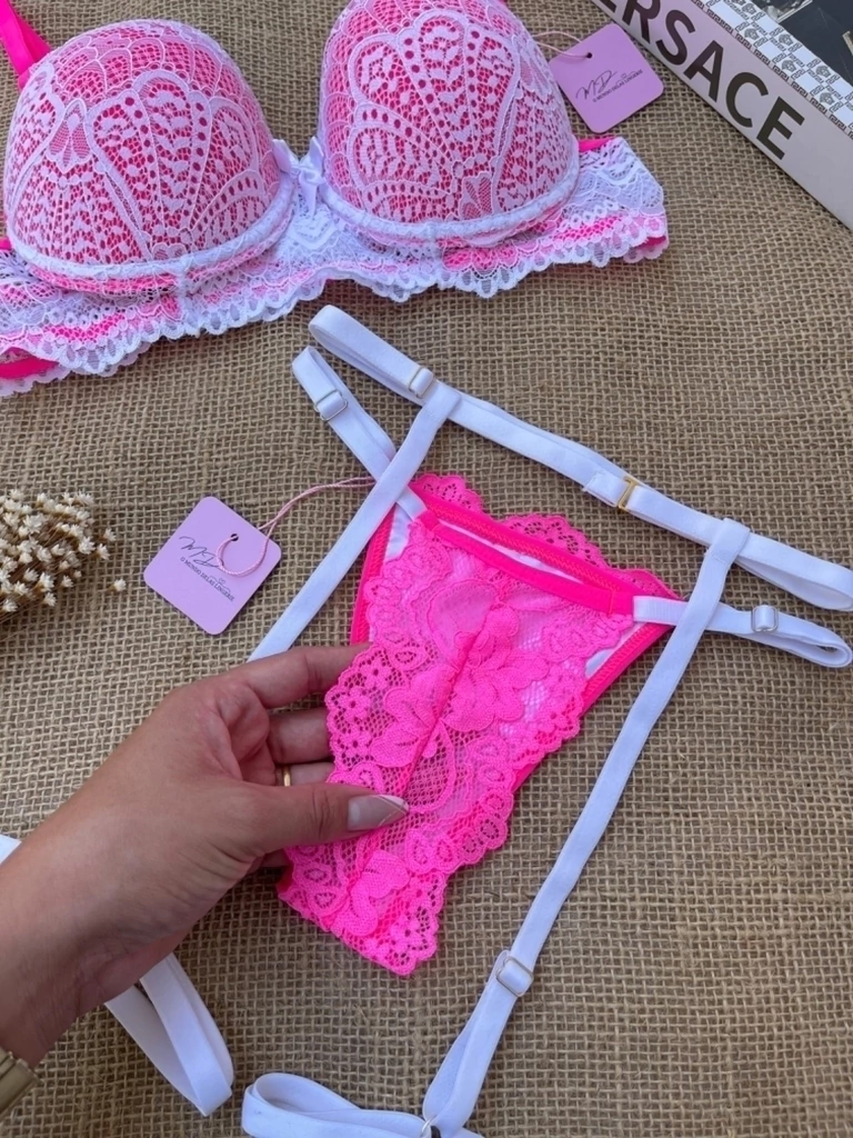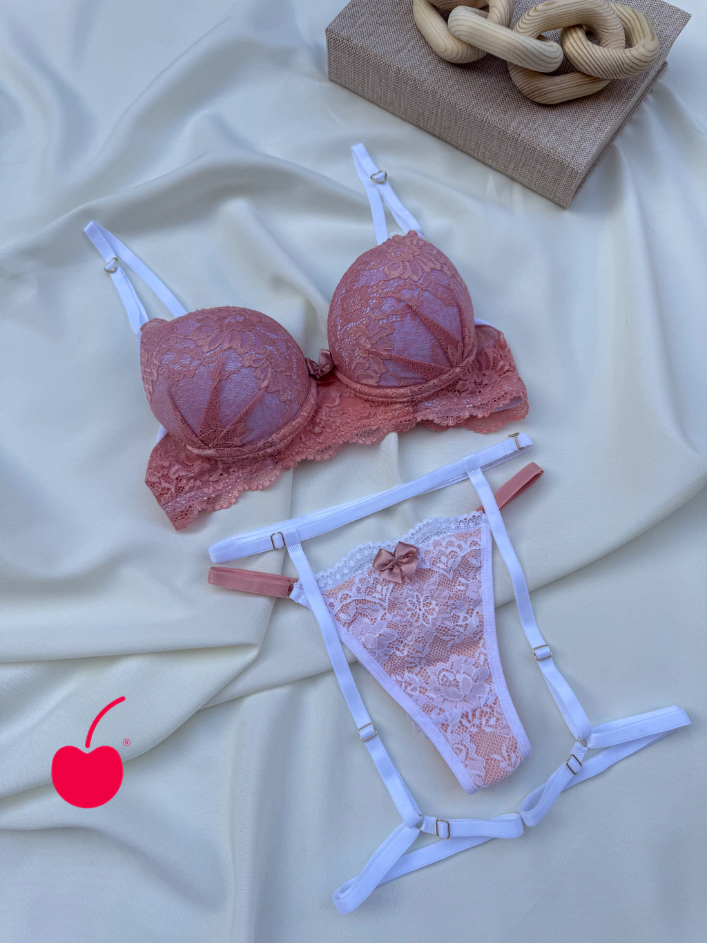 Conjunto ZOE é confeccionado em renda de poliamida com elastano. O sutiã é com bojo e aro para maior sustentação, alças ajustáveis e possuem as regulagem nas alças em formato de coração banhado a ouro.